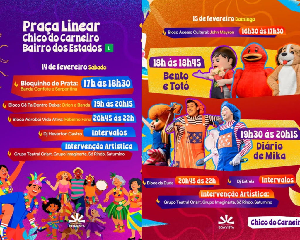 O Carnaval 2026 em Boa Vista promete ser ainda mais especial. Nos dias 14 e 15, a criançada e o público da “melhor idade” terão uma programação cuidadosamente preparada para gerar alegria, diversão e momentos inesquecíveis para toda a família. Com atividades lúdicas, muita música, cores vibrantes e animação do começo ao fim, a festa promete transformar a Praça Linear Chico do Carneiro, no Bairro dos Estados, em um verdadeiro cenário de encanto.