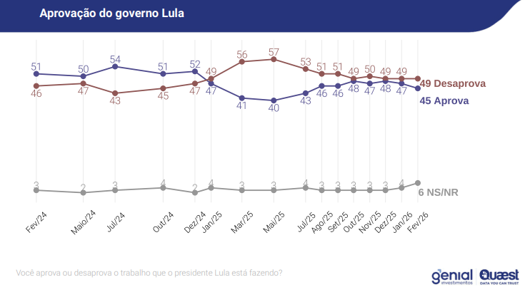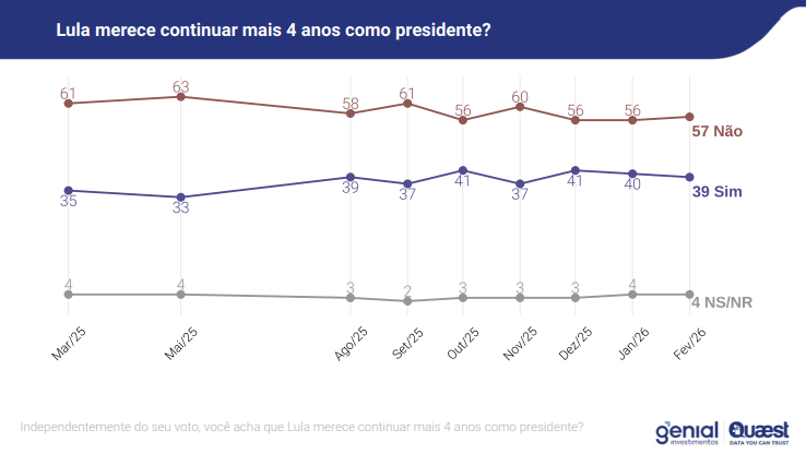 A 22ª rodada da pesquisa Genial/Quaest, divulgada nesta quarta-feira (11) e realizada em fevereiro de 2026, aponta que 57% dos brasileiros avaliam que o presidente Luiz Inácio Lula da Silva (PT) não merece continuar por mais quatro anos no cargo. Apesar disso, o levantamento mostra o petista na liderança dos cenários eleitorais testados para a disputa presidencial.