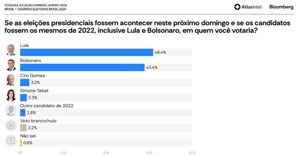 A AtlasIntel também simulou o mesmo embate das eleições de 2022, entre Lula e Jair Bolsonaro. No resultado nacional, o petista venceria por 46,4% a 43,4%. Na Região Norte, porém, Bolsonaro aparece com ampla vantagem: 55,1% contra 31,2% de Lula. Nesse cenário, o atual presidente venceria apenas no Sudeste e no Nordeste.
